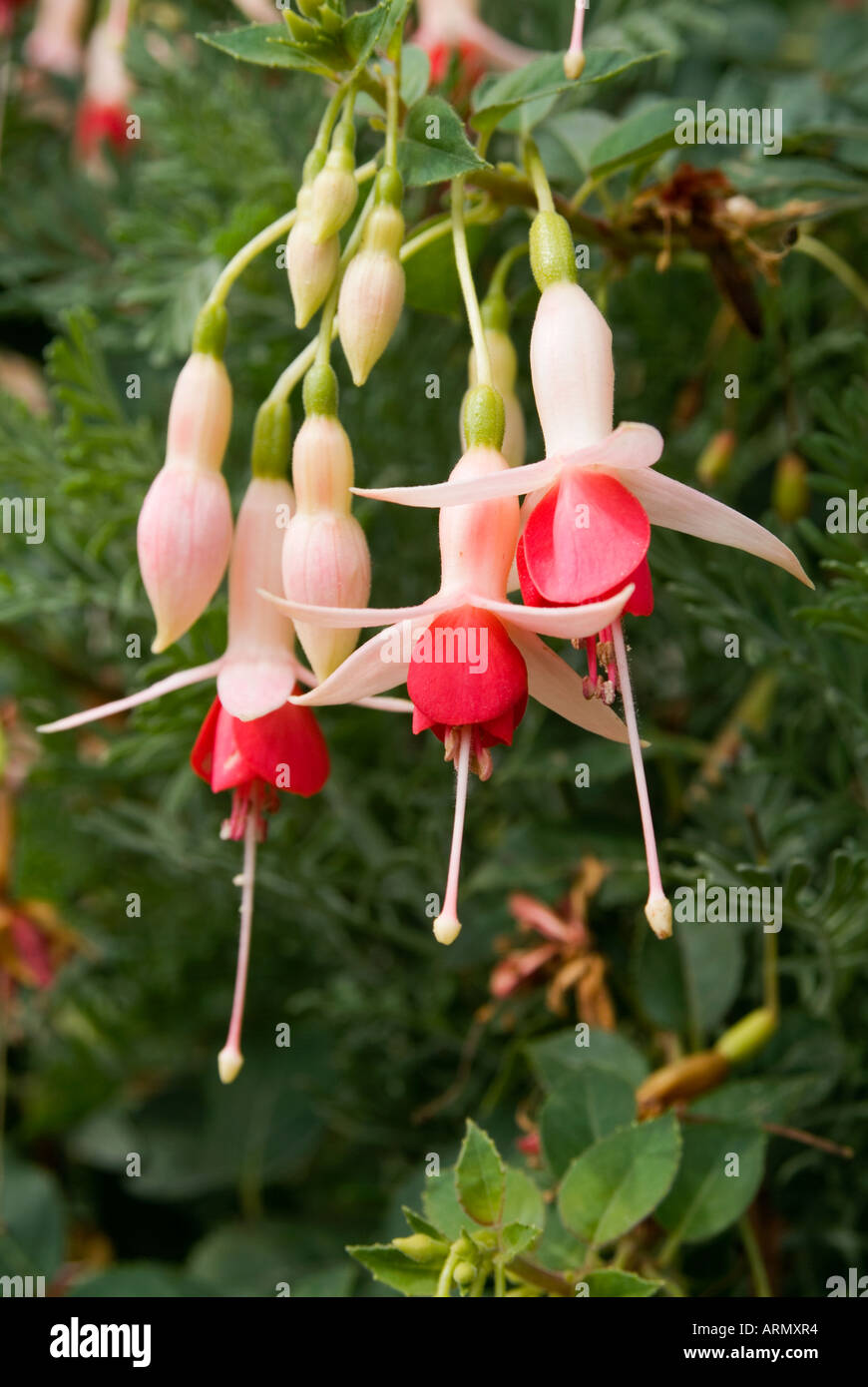 Three Fuchsia Flowers Hanging Down From The Shrub Stock