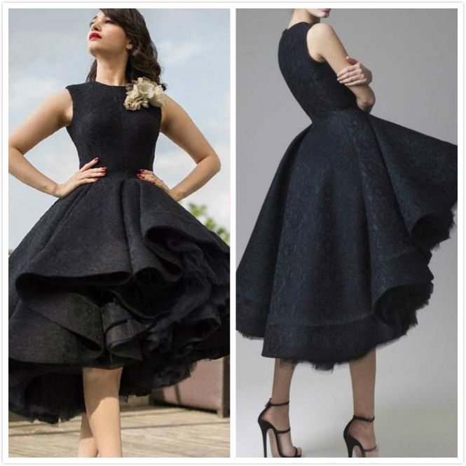2019 Designer Dress Short Front Long Back Party Prom Dresses Elegant Black Lace Dubai Arabic Evening Gowns Tea Length High Low Celebrity Funky Prom